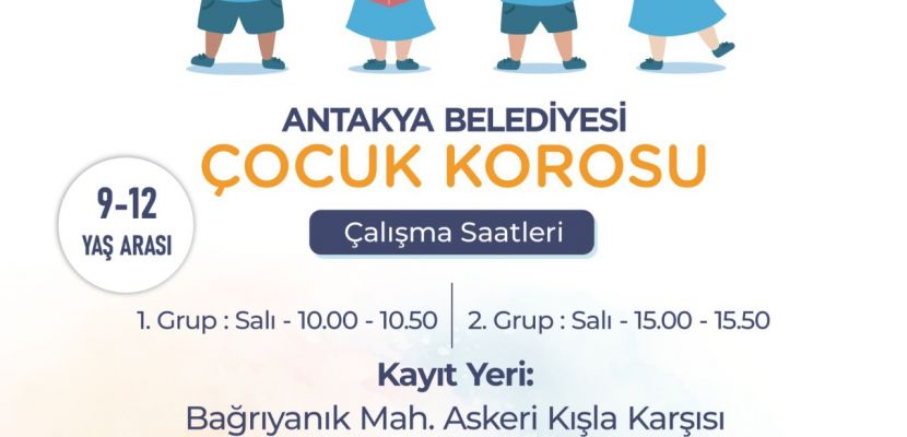 Antakya Belediyesi’nden yapılan açıklamada; 9–12 yaş arası çocuklar için hazırlanan Çocuk Korosu’nun çocukların hem yeteneklerini keşfetmek hem sosyal aktivitelerde bulunmalarını sağlamak için başlayacağı belirtildi. Katılmak isteyenlerin Bağrıyanık Mahallesi Kışla Karşısı’nda bulunan Antakya Belediyesi Ek Hizmet Binası’na gelerek ya da 444 44 31 | Dahili: 1435 No’lu telefonlardan detaylı bilgi alabilecekleri belirtildi.