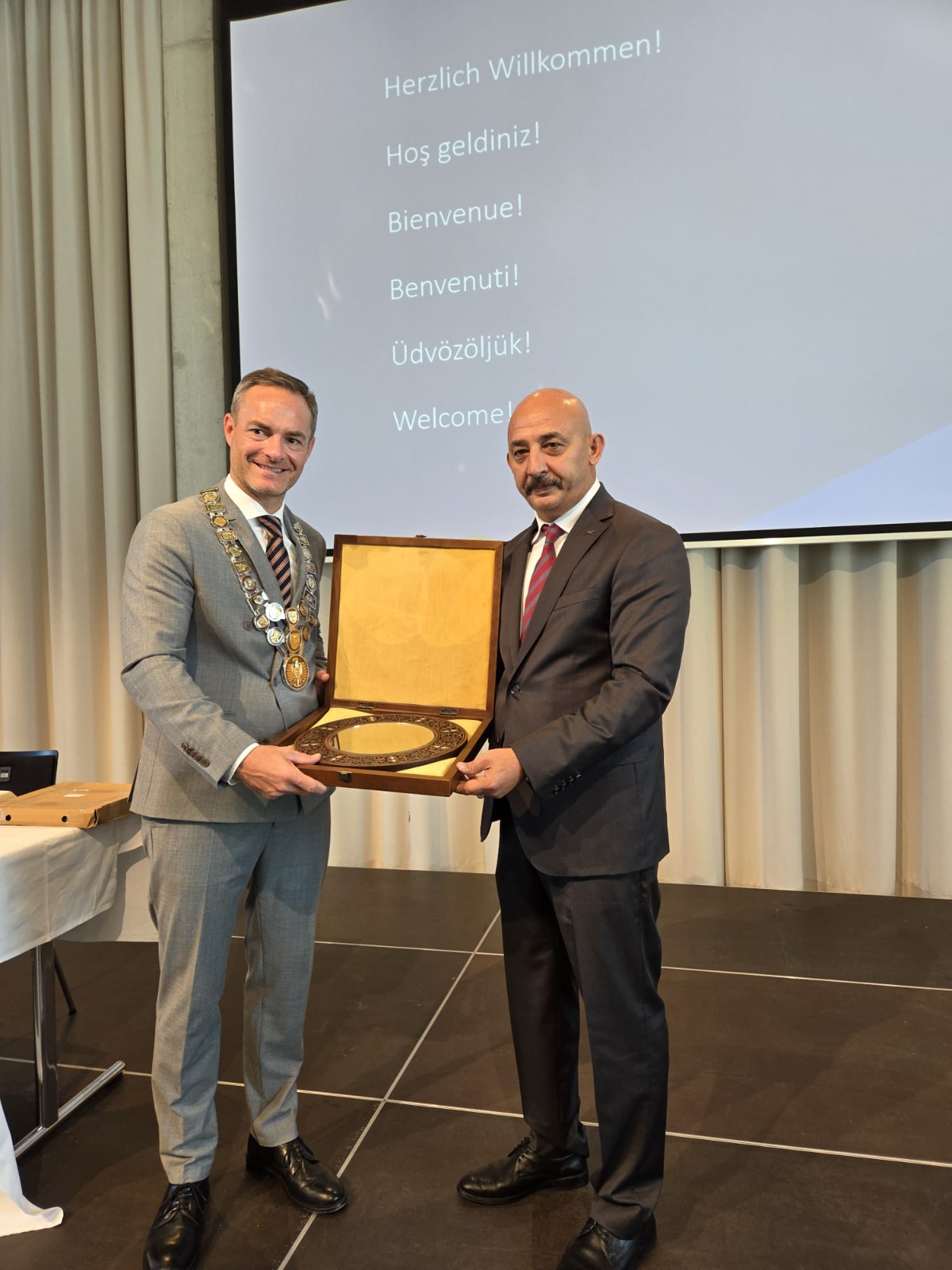 Ziyaret kapsamında iki şehir arasındaki dostluğu pekiştirmek amacıyla, Hatay heyeti, HBB Başkanı Mehmet Öntürk adına Aalen Belediye Başkanı Frederick Brütting’e anlamlı bir hediye takdim etti.