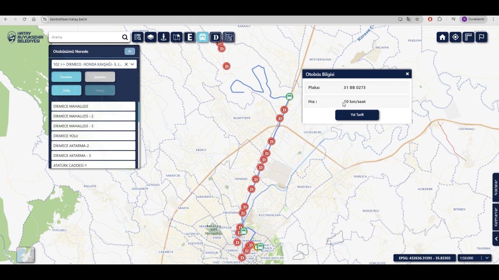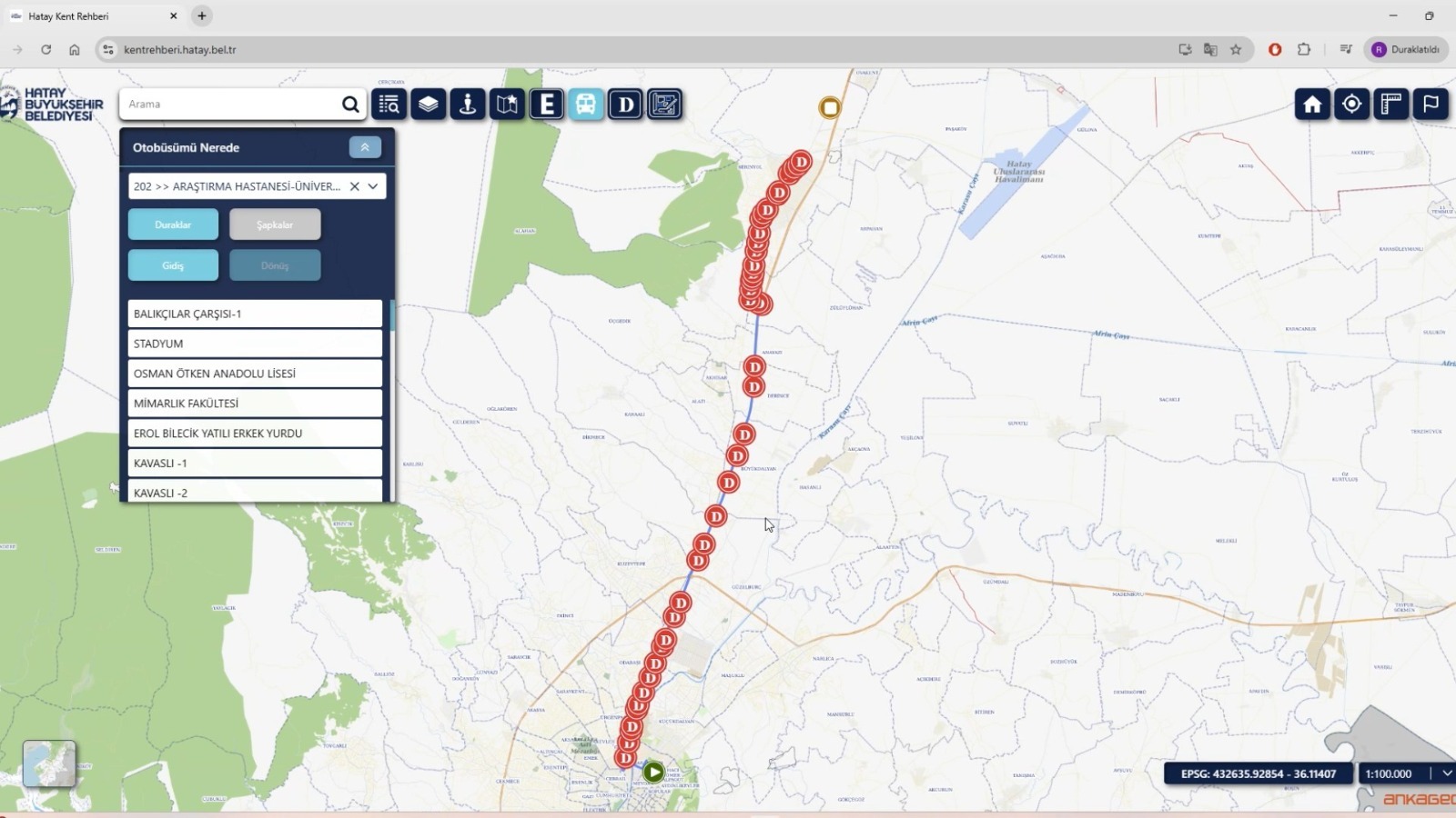 Uygulamada bulunan “Akıllı Duraklar” bölümü ile Hatay genelindeki tüm duraklar detaylı şekilde incelenebiliyor. Vatandaşlar; duraklara yol tarifi alabiliyor, durak bilgilerine erişebiliyor ve otobüslerin anlık konumunu, plaka ve hız bilgileriyle birlikte canlı olarak takip edebiliyor.